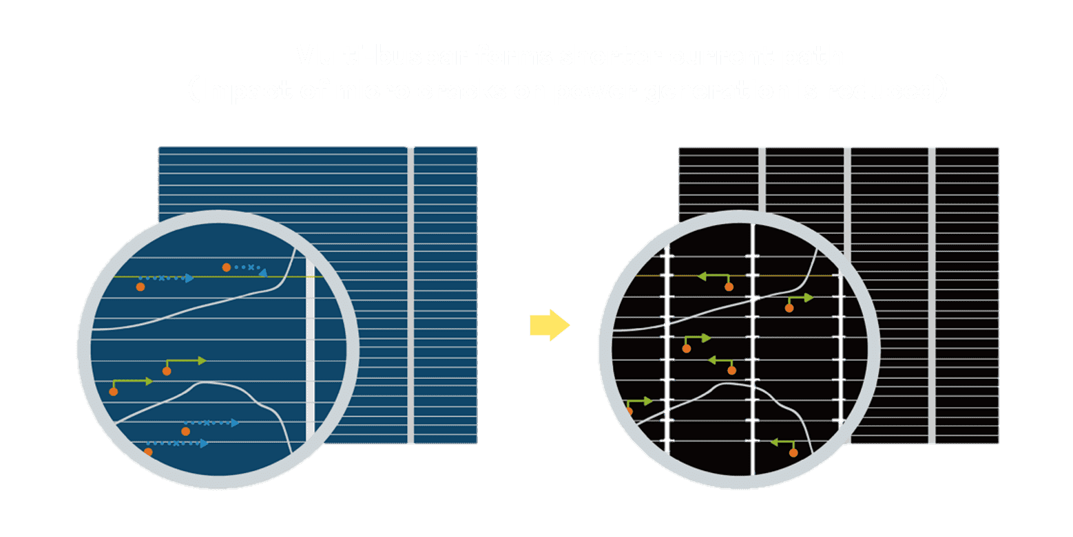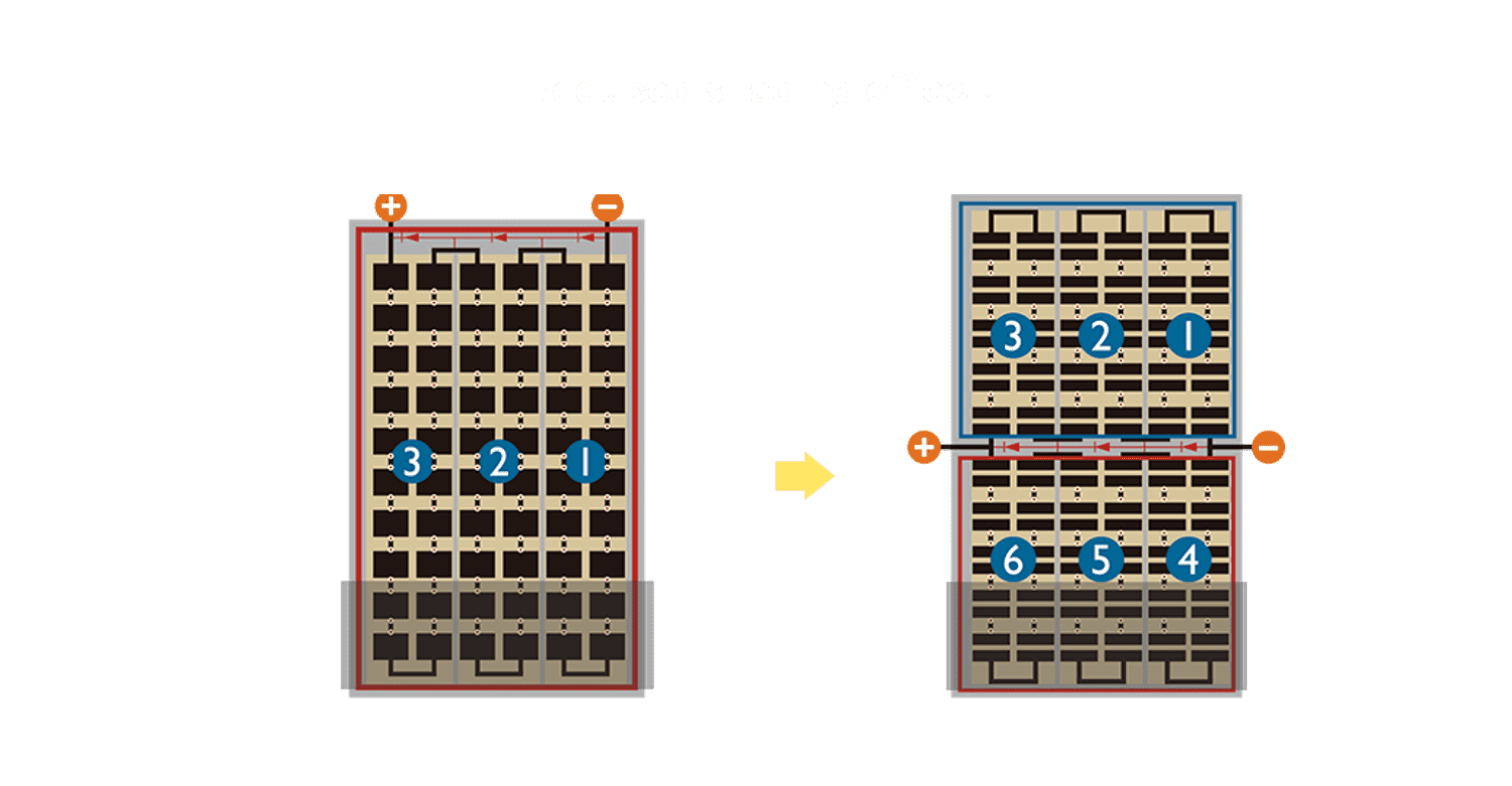 • 结合半切电池,,,降低遮阴影响、、、提升模组抗隐裂能力、、并减少电阻损耗,,进一步提升模组发电效能。。
