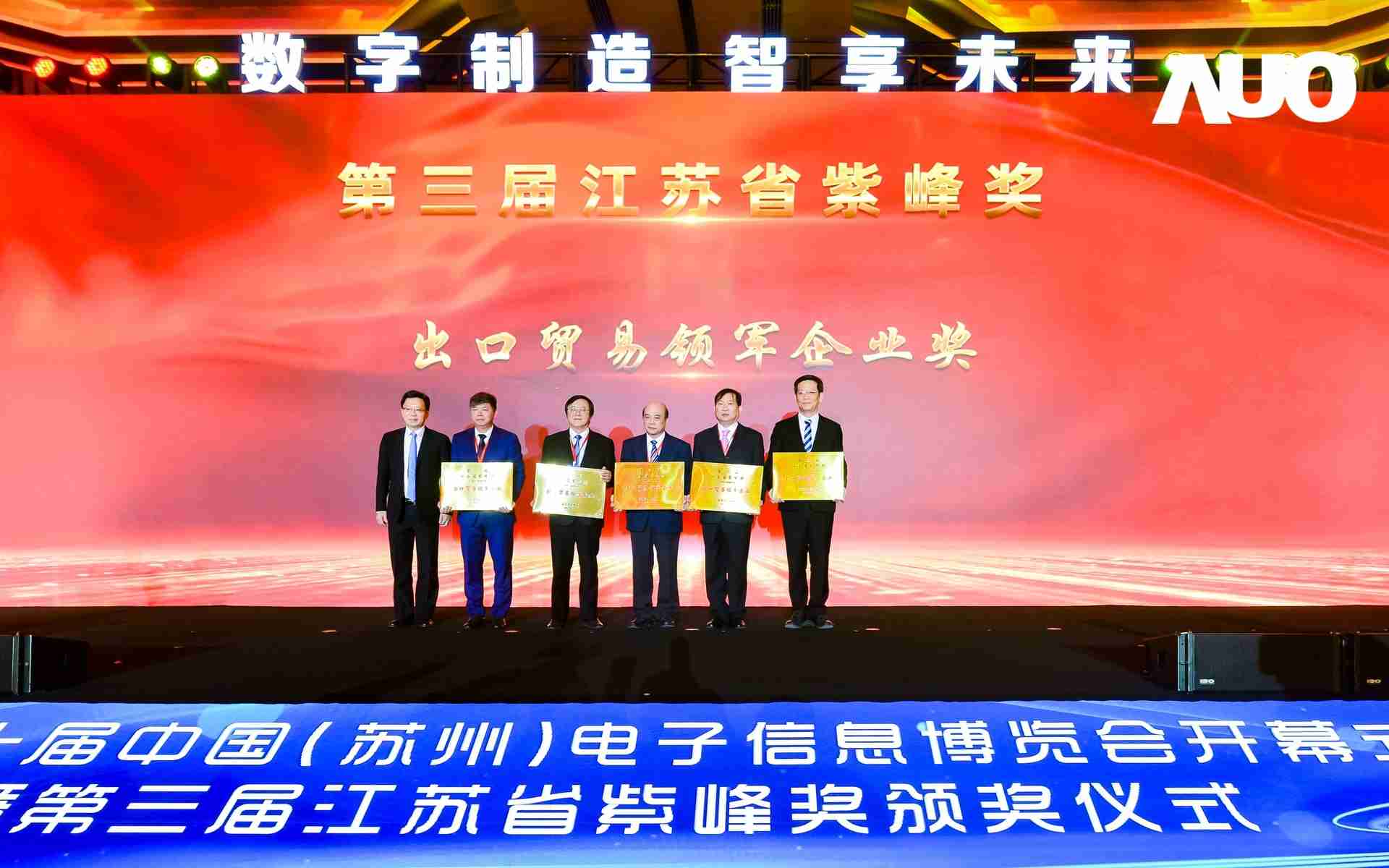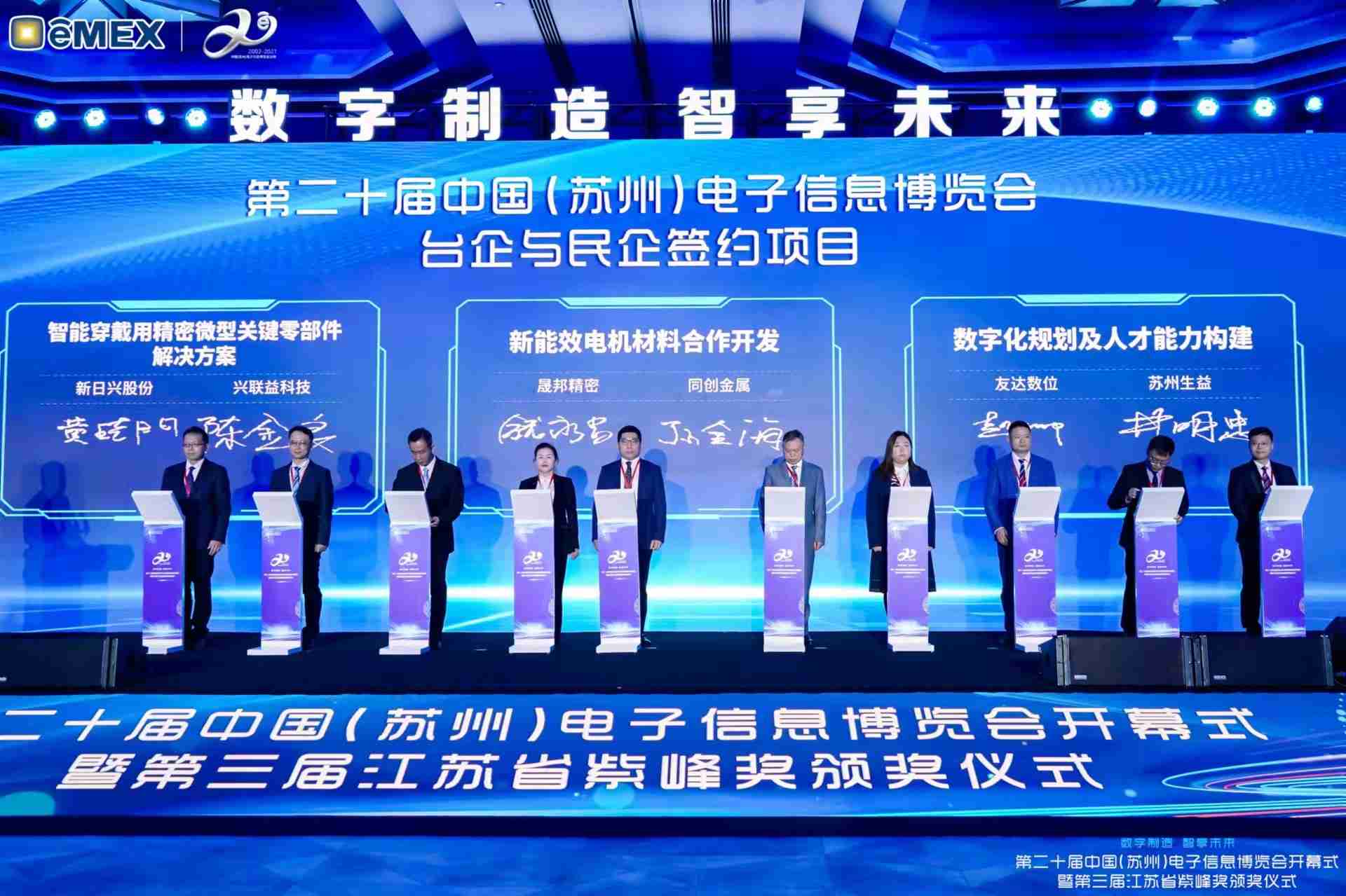 电博会开幕式当天也是第三届江苏省紫峰奖颁奖仪式,,,省台办、、、工信厅、、、、商务厅、、苏州市相关领导均出席并颁奖。。。该奖项为表彰对江苏高质量发展做出积极贡献的在苏企业,,,,由江苏省政府专门设立。。CG电子光电 (苏州) 总经理郭振明代表上台领奖,,,,这也是CG电子苏州连续三次蝉联紫峰奖 出口贸易领军企业奖。。。。CG电子数位总经理赵丽娜女士,,,也参与本次开幕式,,,上台为本地化赋能签署战略合作协议,,将优质服务资源集合、、下沉到更多细分行业,,,为更多地区的制造企业提供数字化转型服务。。。